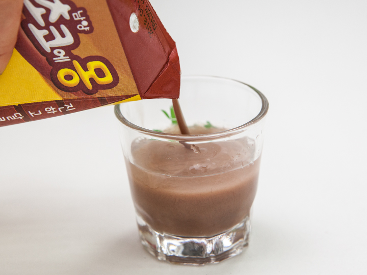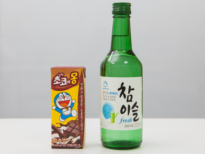 统称为“巧克A梦酒”的人气fusion酒,材料是巧克力饮料“巧克A梦”(图左 1,100韩元)和韩国烧酒“真露”(图右 1,250韩元)。