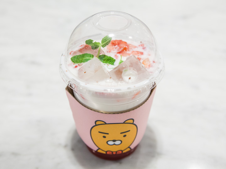 草莓牛奶“Real草莓拿铁(5,000韩元)”口感新鲜, 与流行角色“瑞恩”脸部的杯套结合起来更显可爱。