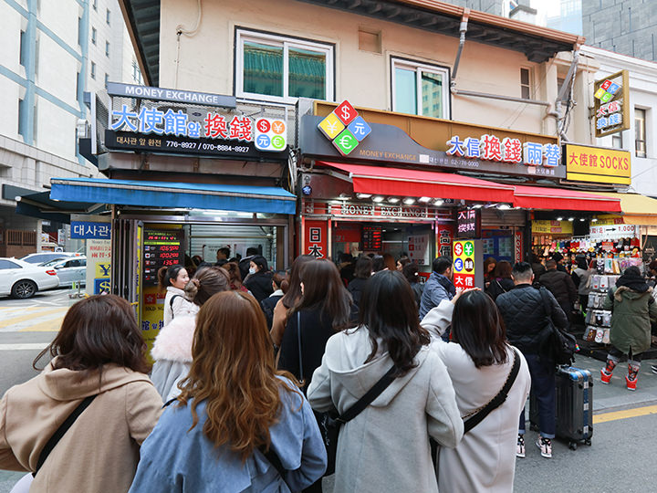 要享受愉快的购物时光,第一步就是换钱!明洞的换钱所因为便宜的兑换率在游客中口耳相传,店前总是排着长长的人龙。