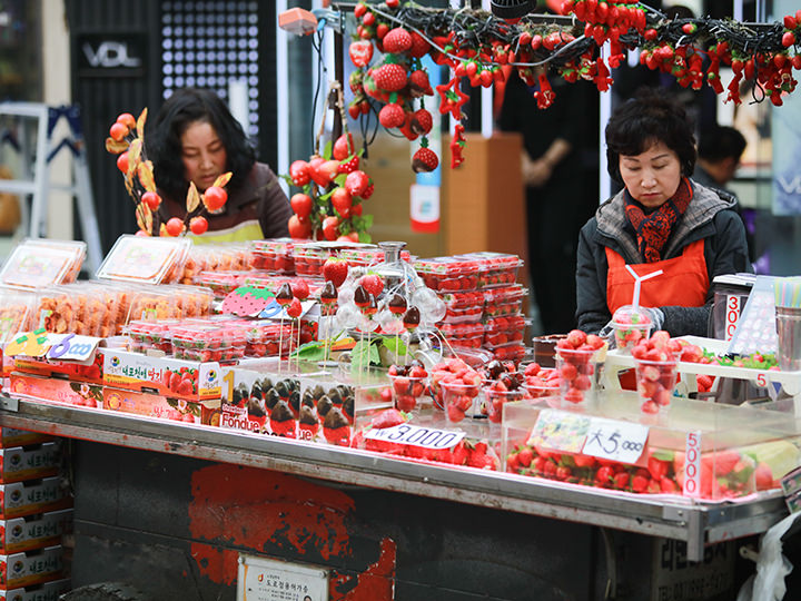 春天是草莓的时令季节,明洞一家卖草莓的摊档也迎来黄金时期。新鲜甜美的草莓去掉蒂部,加上放进杯子的贴心设计,让喜欢甜食的人们无法抵挡它的诱惑。