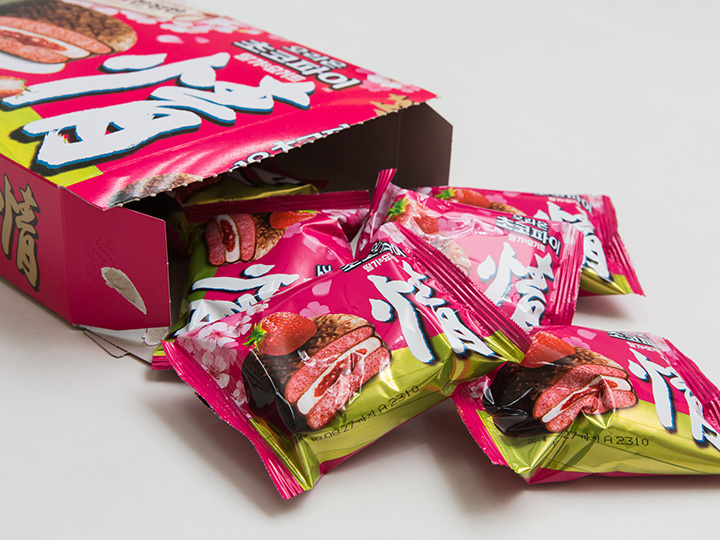 “巧克力派草莓&酸奶(12个,6,000韩元)”用粉色盒子象征着春天的到来,草莓和樱花花瓣也印在每个小包装袋上,可爱到让不吃巧克力派的小伙伴也蠢蠢欲动了!