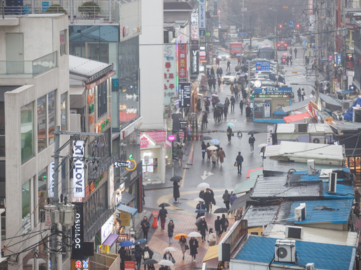 聚集众多年轻人的弘大,有人在避雨的同时,享受着购物和约会带来的快乐。