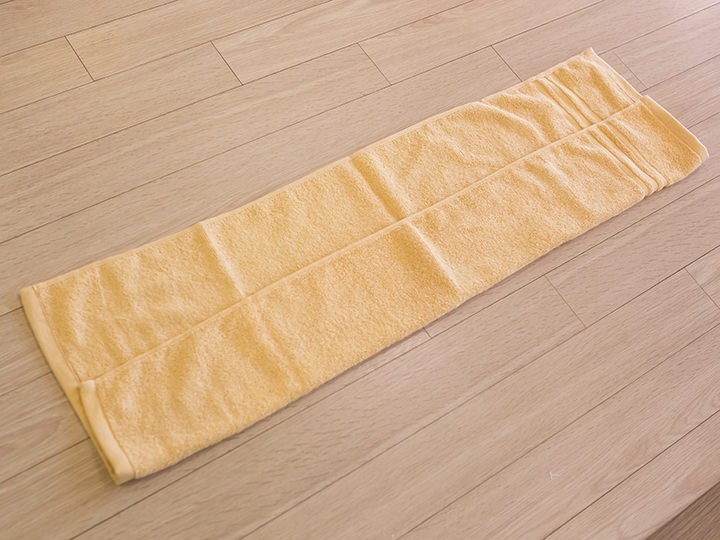 将毛巾两端向外侧折开三次,毛巾中间留出来的大小最好比自己的头要稍微小点,这样佩戴会更加舒适更好看。