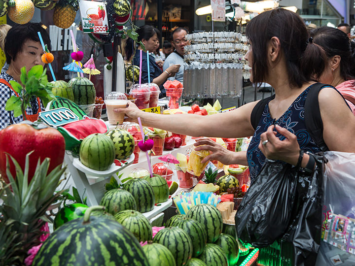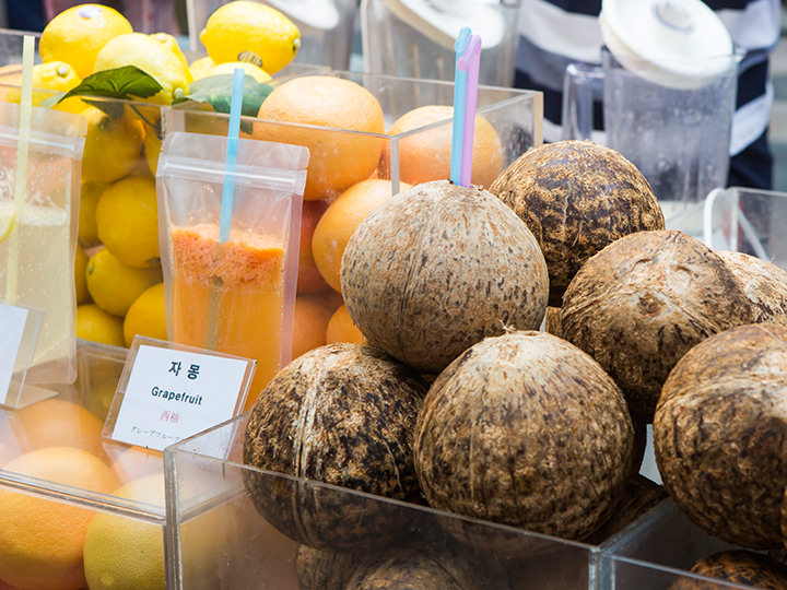 明洞的街边美食中也有属于夏天的新鲜果汁登场。