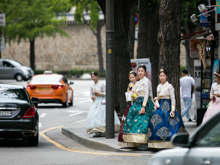 穿着韩服享受旅行的女性手上还拿着各种饮料,在旅行的途中不要忘记补水哦~