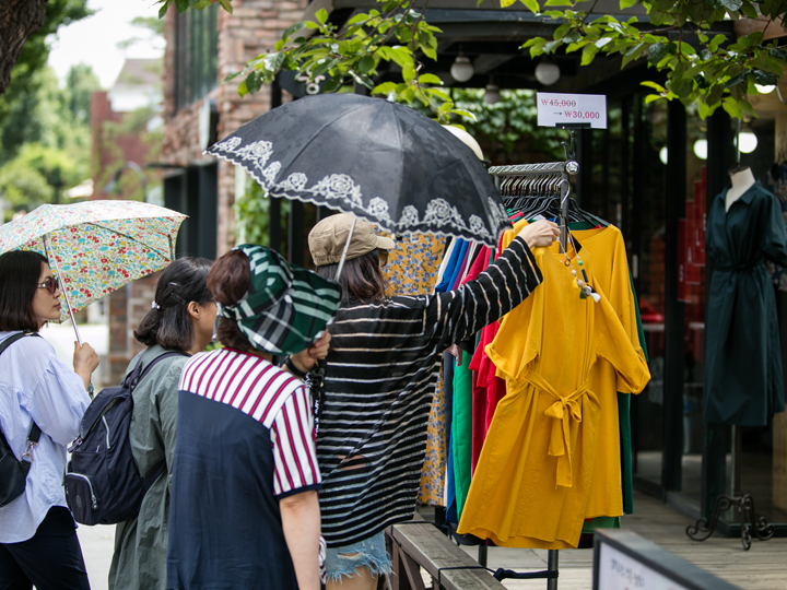 即使是在这样的天气,也有一边忍受着酷暑一边享受购物的游客。用上遮阳伞和帽子,就可以遮挡住很多阳光。
