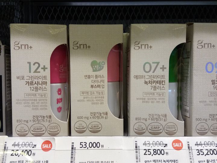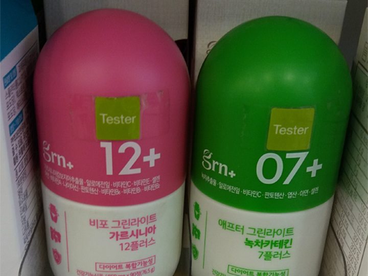 左侧的小粉瓶(44.000韩元)是销量王,它可以有效的降低碳水化合物变成脂肪的可能性哦~