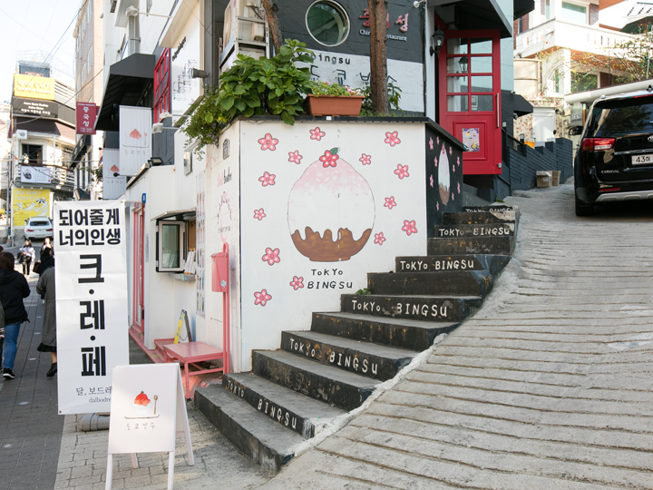 “Tokyo Bingsu”是一家韩国刨冰美食店,墙壁上画有可爱的刨冰图画,颜色也是满满的少女心。