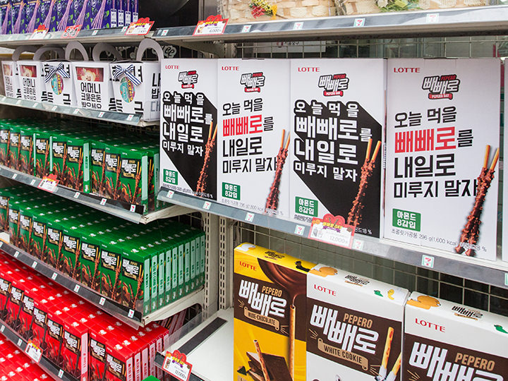 在每年Pepero Day的前后,各大商场,超市,便利店等等都会为了吸引顾客而专设各种各样的Pepero饼干专柜哦!
