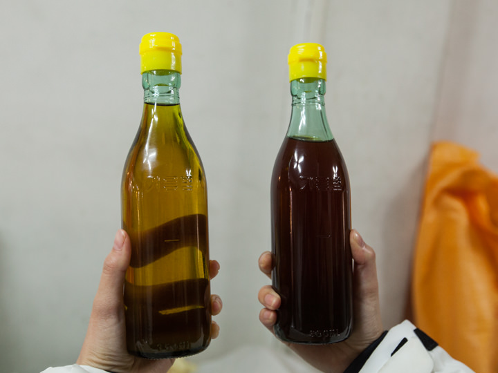 左边生苏子油(350ml、15,000韩元)的颜色显得更加透明,制作过程中没有进行加热,比起加热的苏子油虽然香味没有那么香,但是对身体有益成份更加多。