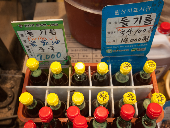 在韩国传统市场上可以淘到一些特别的土特产纪念品。照片上展示的“苏子油”,它不仅非常香而且对身体也很好。