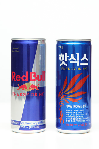 其中,最有名的是起源于奥地利的全球性品牌“红牛(左:2,900韩元)”。虽然其价格偏高,但是抗疲劳效果显著。同为蓝色包装的还有乐天公司推出的“Hot6(右:1,000韩元)”,因价格合理而受年轻人欢迎。
