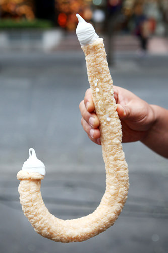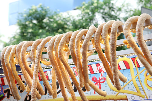 小吃摊的上方挂了满满一排形状像拐杖的空心点心,这个到底是什么呢?