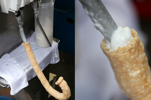 小吃摊大叔开始用机器往“拐杖”里填东西了。仔细一看,原来是香草味冰淇淋。