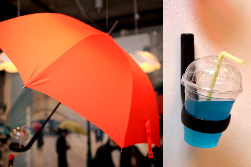 “布拉万”台风虽然已经过去,但最近天气阴晴不定,出门带伞成为习惯。下面就一起来看看雨天必备用品里有哪些新发现。在弘大的“KT&G想象空间”能看到设置在伞柄上用来放饮料杯子的圈环,免得双手都拿着东西麻烦,很有趣的想法吧?