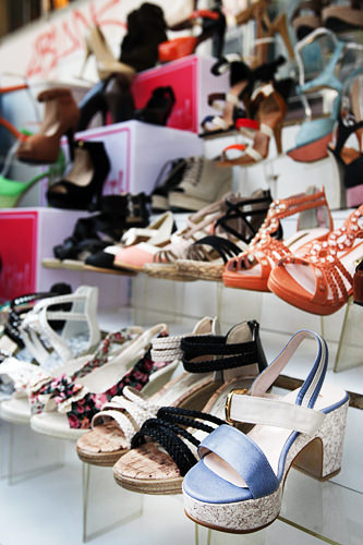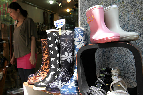在弘大的停车场街上能看到款式新颖的雨鞋。今年潮人们必穿的雨鞋中短筒和带花纹的款式人气剧增。