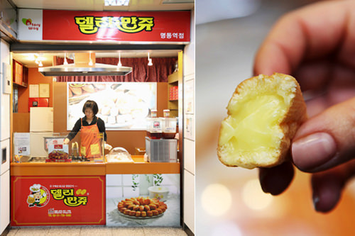 顺着地铁站飘过来的美食香味寻去,能发现地铁定点糕点铺“Deli ManJoo(1袋有10个,约2,000韩元)”。这种糕点是在小小的鸡蛋糕里塞满热乎乎的卡仕达酱制作而成。店铺不同,糕点的形态也稍有不同,有方格形、玉米形和小鸡形等。用全自动机器烤糕点的样子看着都觉得新奇。