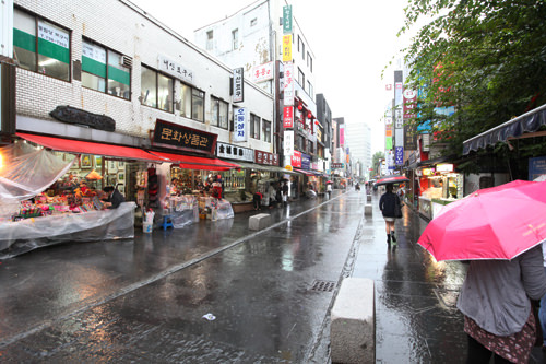 购物景点“Ssamziegil”因为有结实的顶棚,能看到避雨游客放心拍照留念的样子。