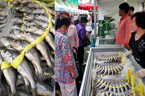 全罗南道灵光的干黄花鱼,是中秋佳节最受欢迎的馈赠佳品之一。听到促销消息后,大妈们纷纷前来选购。