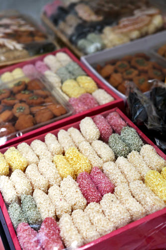 光州卖场里陈列着美味的韩国传统点心韩果。五颜六色的韩果套装,种类和大小包装齐全,也很适合做回国礼物。