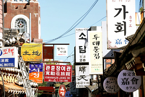 从大厦林立的地铁1号线钟阁站的大路上朝仁寺洞方向走过去,会出现这条细细的小巷道。