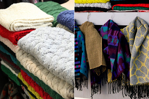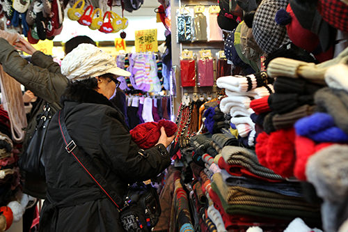 在深受年轻女性青睐的江南站地下购物中心里,随处可以看到冬天的必备品,包括款式新颖的围巾、帽子等。据说,今年流行看起来暖和且色彩艳丽的编织商品。另外,可随意搭配的披肩各式花纹也十分齐全。