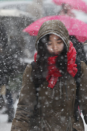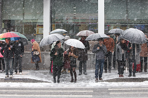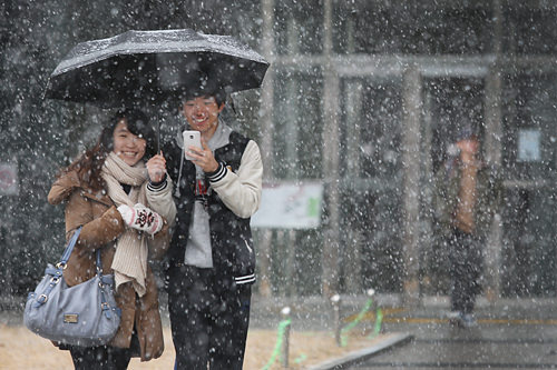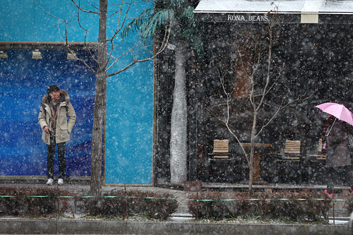 在韩国人们相信下初雪时一起约会以后会很幸福。虽然今天下的雪不是初雪,但算得上是正式降临的第一场大雪,所以一对对恋人反而不畏寒冷,在雪的祝福中进行甜蜜的约会。
