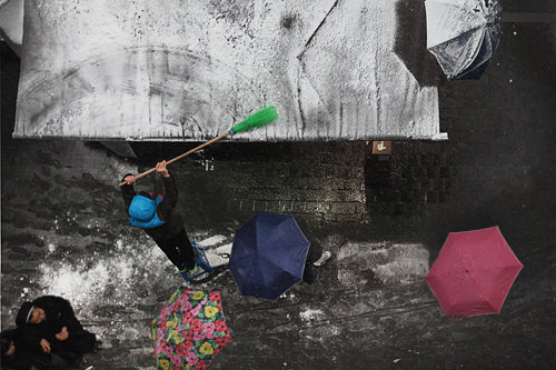 为了不让突降的大雪在屋顶结成冰,很多人都赶在雪堆积起来之前把它清除。
