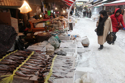 当地人和游客经常熙熙攘攘的南大门市场也因突降的大雪而变得萧瑟不少。