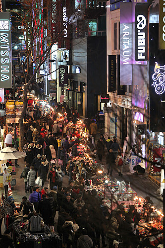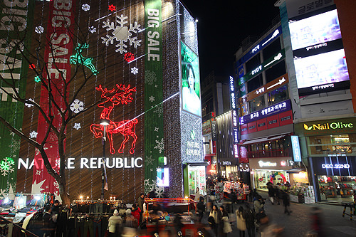 虽然晚上气温已降到零下,但处处可见的圣诞促销活动反而让人们的购物热情高涨。在辞旧迎新的12月,做好各种防寒准备,开始您的明洞购物之行吧。
