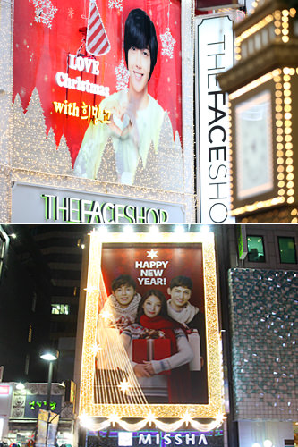 临近圣诞,街道上到处挂满华丽的圣诞灯饰。化妆品店外韩流明星的招牌也换为圣诞主题。