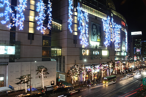 在大路的对面,乐天百货店从11月开始就已经换上了夺目的灯饰。大面积的照明让明洞的夜变得更加美丽。