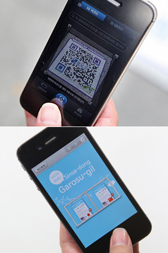 最近像导游手册或网站等接触旅游信息的方式越来越多样化。在人气旅游景点新沙洞林荫道,设置了一种可以用智能手机确认的QR码。