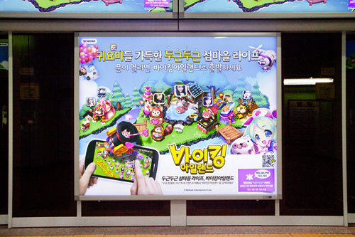 那就是和智能手机或客户端有关的广告。在韩国智能手机已经相当普及,特别是年轻人乘坐大众交通工具的时候,总是用智能手机来玩游戏消磨时间,游戏广告也应运而生。