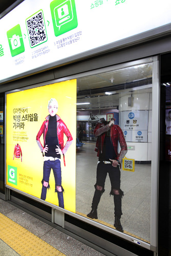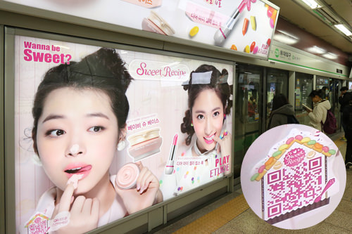 这是地铁站内韩国化妆品“伊蒂之屋”的广告。很多广告会附上二维扫描码,有合心意的商品可以马上连接到手机上,便于您查看相关信息。