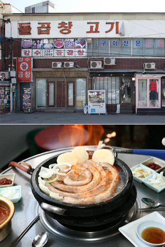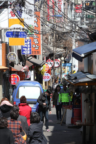 在这样的弘大街区里,从近来越来越受人瞩目的“停车场街”往里走,有一条“牛小肠街”。从老字号店铺到连锁店,大大小小的牛小肠店约有15家。