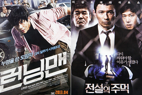 此外,实力派演员申河均(左)主演的《Running man》,黄正民(右)、尹济文主演的动作电影《传说的拳头》,是目前韩国影院里正在火热上映的两部人气电影。