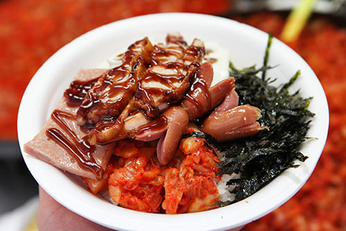 路边小吃摊里最著名的小吃,要数分量很足的“杯饭”。其中最受年轻人欢迎的是以香肠、火腿等为添头的热乎乎的拌饭杯饭(3,000韩元)。