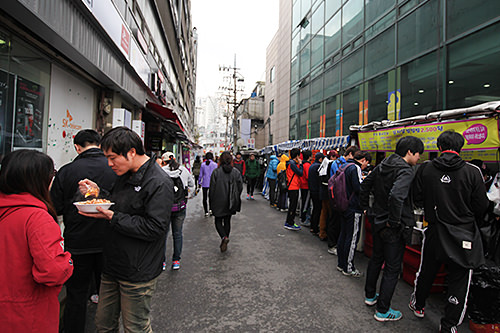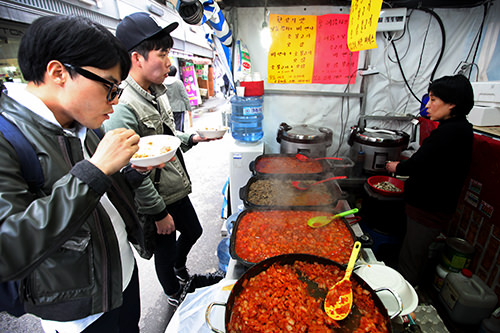 但因为路边小吃摊的存在,附近饮食店生意变得不如以前景气。于是今年1月份政府下达了部分路边小吃摊必须撤走的规定。虽然现在这里规模缩小了一些,不过鹭梁津地铁站的3、4号出口附近还是剩下约50来个路边小吃摊。要是想要节省时间和费用,就来这里尝尝在年轻人当中很有人气的街头小吃吧。