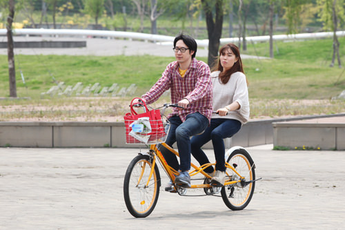 在公园里还能看到踏双人脚踏车的情侣。盘浦汉江公园有租赁脚踏车的地方,可以一边骑着自行车看风景,一边享受微风拂面的感觉。