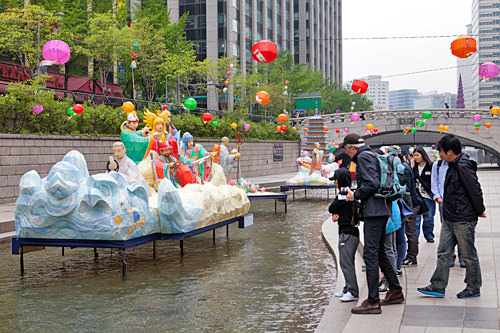 在清溪川,各种动物或佛祖造型的花灯也逐个排开,吸引了人们的视线。晚上点起花灯之后,绚丽的光景可是别有一番味道哦。