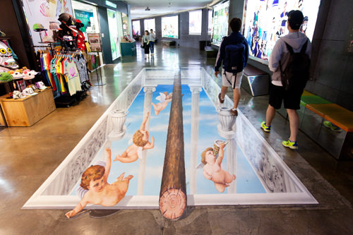 现代百货店新村店从4月4日开始在地下2层连接U-PLEX的通道上画上了名为“共度难关的希望之桥”的3D立体图画,在向顾客传递希望的同时也给购物观光的游客增加了一个可以拍照的好去处。