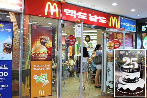 今年是麦当劳进入韩国的25周年。为了纪念它,店铺橱窗的玻璃用生日蛋糕装饰,还推出了纪念汉堡。此外,在韩国2013年作为人们熟悉的商品的纪念日很多的一年而成为话题。