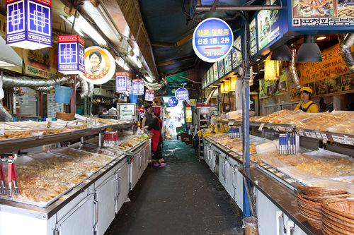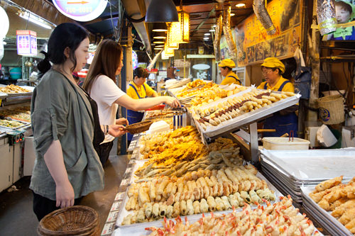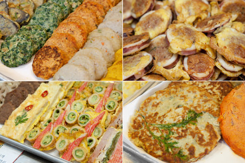 小吃街每家店铺前的摊子上陈列着各种各样的韩式煎饼。其中将煎饼和各种材料涂上蛋液后将两面煎至焦黄的煎饼是最有人气的。迷你猪肉煎饼、豆腐、鱿鱼等煎饼种类繁多,价格也非常便宜,1个500韩元起。