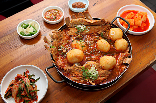 脊骨土豆汤是将带肉的猪脊骨和土豆放在锅里一起炖煮的一道料理。韩国人很喜欢在吃脊骨土豆汤时喝烧酒,有时喝多了,将其作为醒酒汤也是不错的选择。