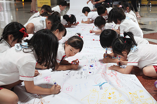 为了向为保卫国家而牺牲的军人们表达感谢与缅怀之情,还设置了专门的书写区。国家的未来栋梁们,到底写的是什么呢?