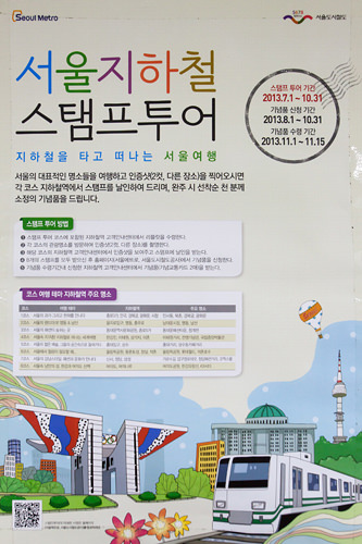 乘地铁游首尔时共有8条推荐路线。如果去过任何一条路线中的2个以上的地方(要有照片为证),只要在地铁站的顾客服务中心(提供韩文说明册)向工作人员出示照片,便可以获盖纪念印章。