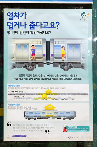 乘坐地铁的人减少的时间段,也有因地铁空调风太冷而不适的人。因此地铁5~7号线的4、5号车厢温度比其他车厢调高2度。为了让更多人知道,地铁上张贴了列车的中央部分的车厢温度略高的宣传海报。