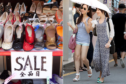韩国连续几天持续着超过30度的高温天气,但戴着墨镜,手举遮阳伞享受购物的年轻人也不少。虽然暑热正盛,但很多店铺的凉鞋、夏季服装早已开始打折。