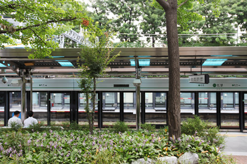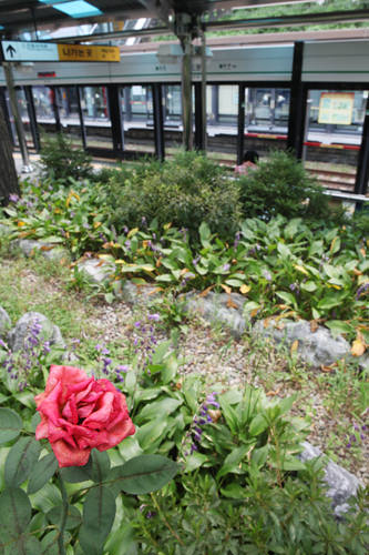 草木葱茏,适合休息的好地方。这里是公园吧?但怎么有地铁指示牌呢?原来,这里是地铁新踏站,韩国唯一在地铁站内创建公园的地铁站。